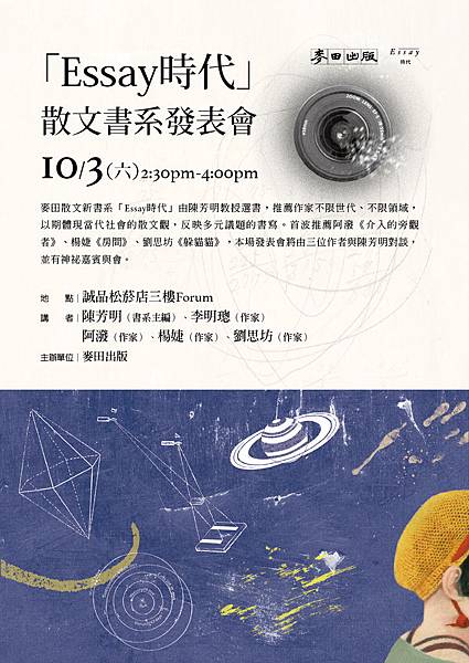 麥田「Essay時代」書系由陳芳明教授主編,選書不限世代,不限領域,舉凡能體現當代社會的散文觀以及反映多元議題的書寫,都是我們關注的對象。我們期許一個創新的文學發聲,在新的世紀展現應有的文化能量。